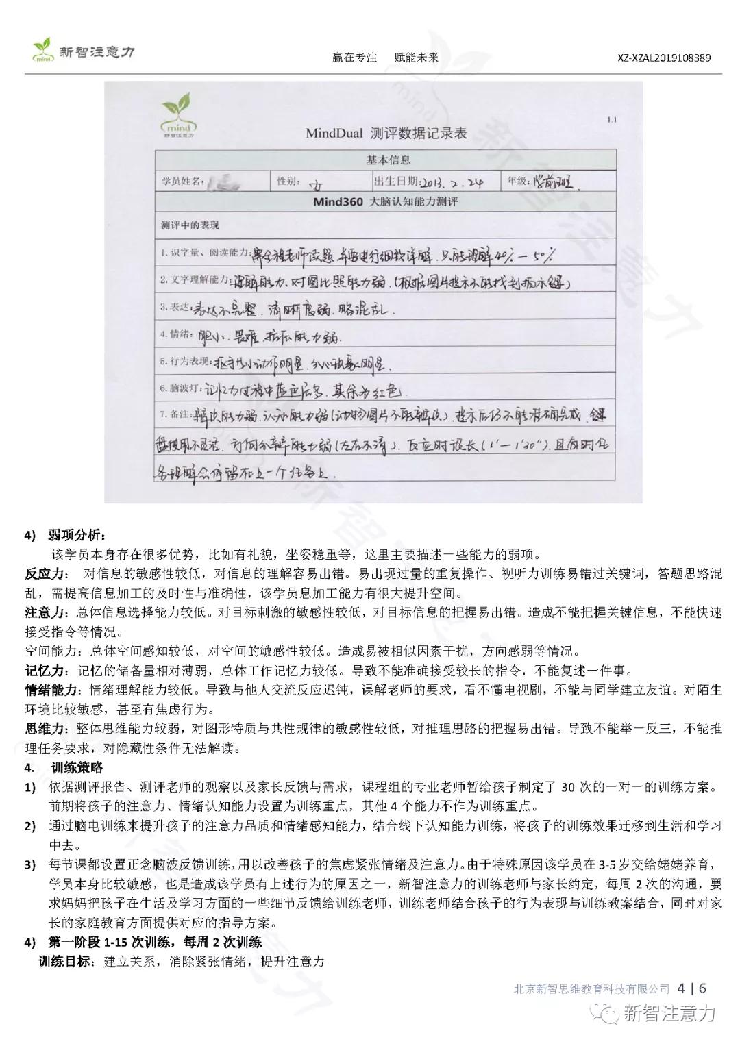 在新智注意力,我们通过脑电生物反馈训练、认知能力迁移强化训练、家庭养育方案三个维度来改善学员的弱项能力。借助安全便携的生物反馈设备,采集学员大脑认知能力相关的生理参数(EEG),与训练项目结合,实施客观、精准地测评,因人而异地1V1训练。在整个训练周期内,心理特教老师也会根据每位学员的特点,借助心理学工具方法等,实施因“脑”施训,快速解决家长们关心的问题;当然,学员的能力的提升与每位家长的坚持与配合是分不开的。下面我们在近期刚毕业的学员档案中摘取一例,供家长们了解新智注意的训练方式。