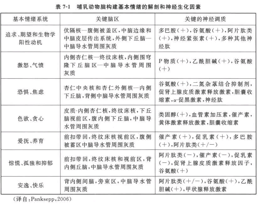 人类的7类情绪子系统中有4类属于生物学阳性情绪,也就是对个体生存和种族延续所必须的食物、水和安居之地以及性爱等的驱动的情绪,包括追求与期望、贪心与色欲、爱抚与养育和安逸快乐等。