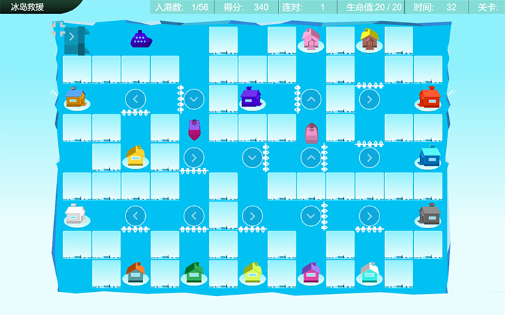 “冰岛救援”通过让操作者观察、注意在屏幕上不同颜色、不同速度的小船,找到它们所对应的相同颜色的船坞,再运用鼠标控制栅栏开合,改变船的行驶路线,在规定时间内,让小船回到属于自己的船坞。