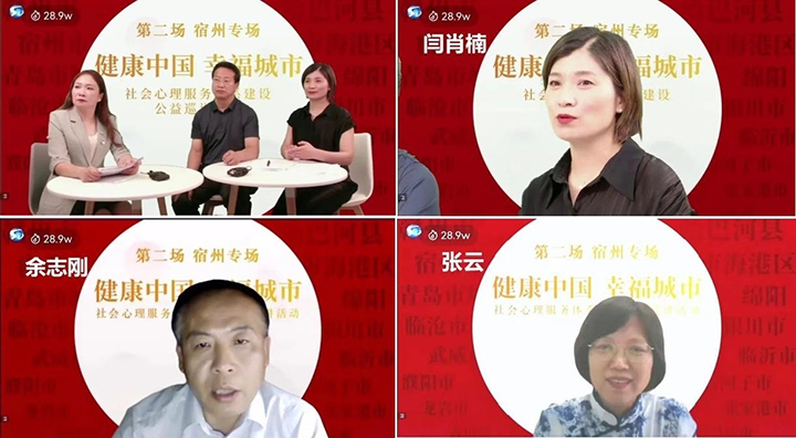 此次公益巡讲活动以“健康中国、幸福城市”为主题,以“社会心理服务的实际应用”为主线,围绕全国各地区社会心理服务体系建设三年试点工作进行总结与提炼。活动以线上直播形式举行,由中共宿州市委政法委员会、宿州市卫生健康委员会主办,在宿州市广播电视台云平台、心世界直播平台、凤凰网、城市论坛等4个平台同时直播,直播热度一路飙升,总观看量达到105.4+万人次。活动由五个环节组成,即专家致辞、心心发布、试点工作汇报、心理服务宣传片与圆桌会议。