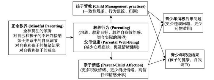 正念教养可以促进一般教养行为和提高父母的健康水平, 这两者又通过对孩子的有效管教行为和良好的亲子情感进而影响青少年的积极结果(心理健康和自我调节能力)和消极后果(违规行为、药物滥用)。有助于化解一些根深蒂固和“自动化”的消极和不作为的亲子关系模型的循环,帮助父母免受由于他们自身的心理健康或教养行为而引起的来自环境的、家庭的和教养相关的评价压力的影响。