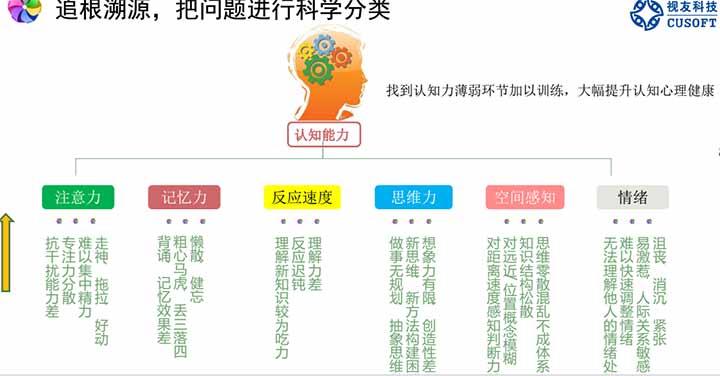 据悉该系统主要对人的大脑的认知能力 (反应力、注意力、记忆力、空间感知力、情绪管理力、思维力等) 进行科学地测评分析,并根据情况智能创建训练课程,训练更科学、系统化。针对认知力薄弱环节训练,可大幅提升认知能力。